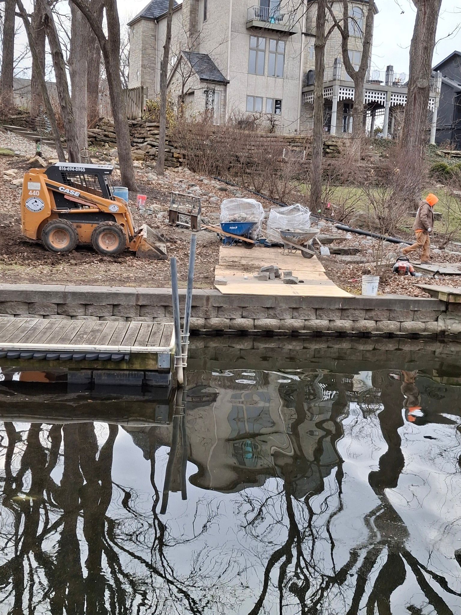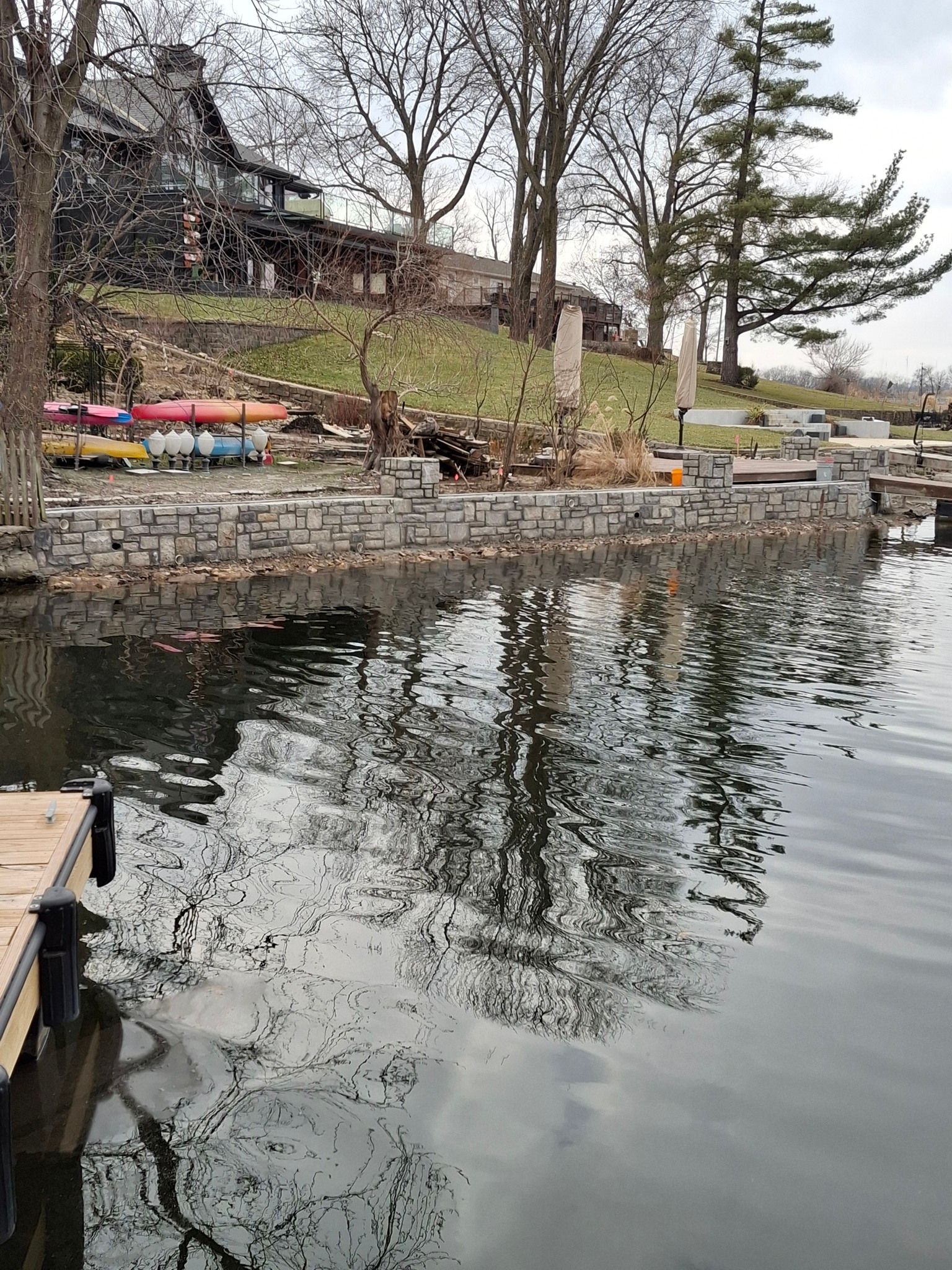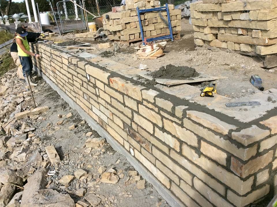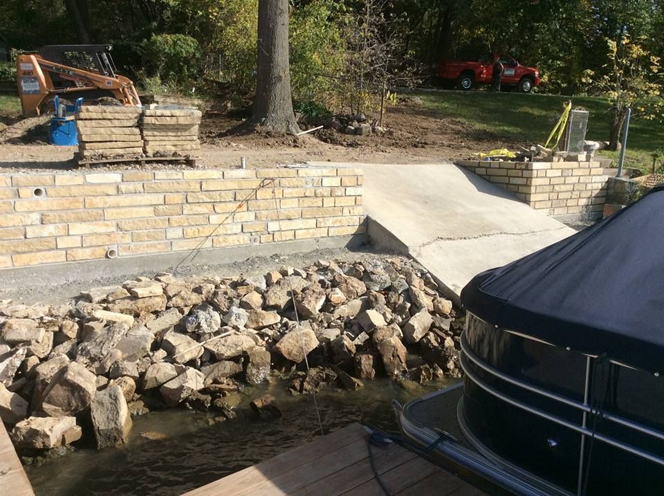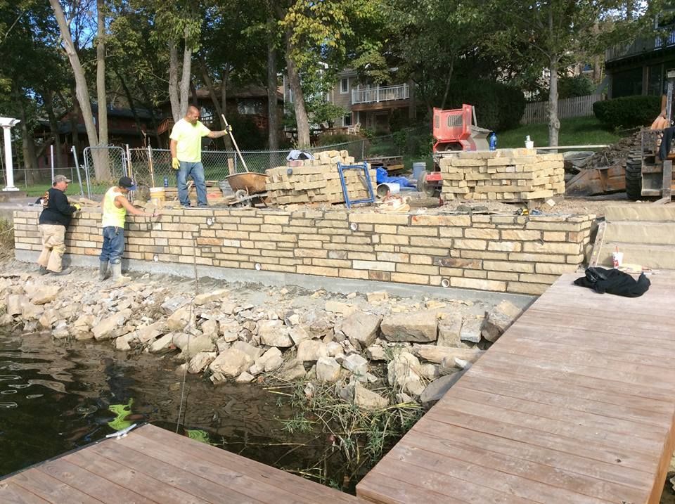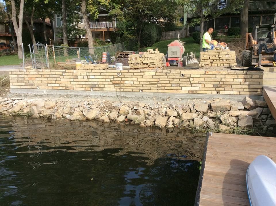 Seawall is a wall or embankment erected to prevent the sea from encroaching on or eroding an area of land. A seawall begins with an 8"x12"x16" CMU structure, and 1/2" rebar dowels on 3' centers. It is 100% concrete grouted and continued with 8" of stone facing. It then will be constructed vertically and horizontally up and over CMU to make this seawall a unit.